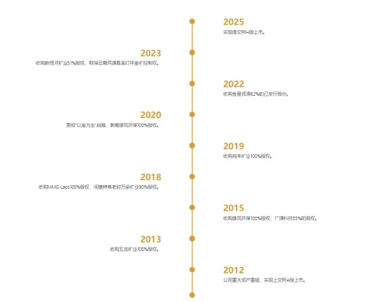 具体来看,2013年收购五龙矿业100%股权;2015年收购雄风环保100%股权、广源科技55%的股权;2018年收购MMG Laos100%股权,间接持有老挝万象矿业90%股权;2019年收购瀚丰矿业100%股权;2022收购金星资源62%的已发行股份;2023年收购新恒河矿业51%股权,取得云南洱源县溪灯坪金矿控制权。2025年3月10日成功在港交所上市,成为第三家"A+H"两地上市的国际化黄金生产商。
