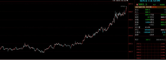 受地缘政治动荡、央行增持以及美联储降息等多处利好加持,国际金价持续大涨,目前已经突破3600美元/盎司,纽约期金一度突破3700美元/盎司,2025年以来每盎司上涨1000美元,涨幅近40%。